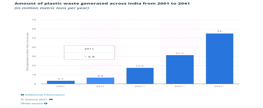 According to the statistic report released by Statista,the amount of plastic waste generation in every decades increasing around two folds since 2001, thereby the estimated quantity of plastic waste in the upcoming decades would be reached to 31.4 million metric tons in 2031and be over 50 million metric tons in the year 2041and the quantity of waste generation is increasing in every year. In the present scenario in India, only 60% of plastic waste is being recycled and the balance amount which turn around 7 million(70 lakhs) metric ton goes either landfills or burning yard or ends up polluting streams or groundwater resources. In eventual this plastics became a polluting substance like micro-plastic particulates in air, in our environment.