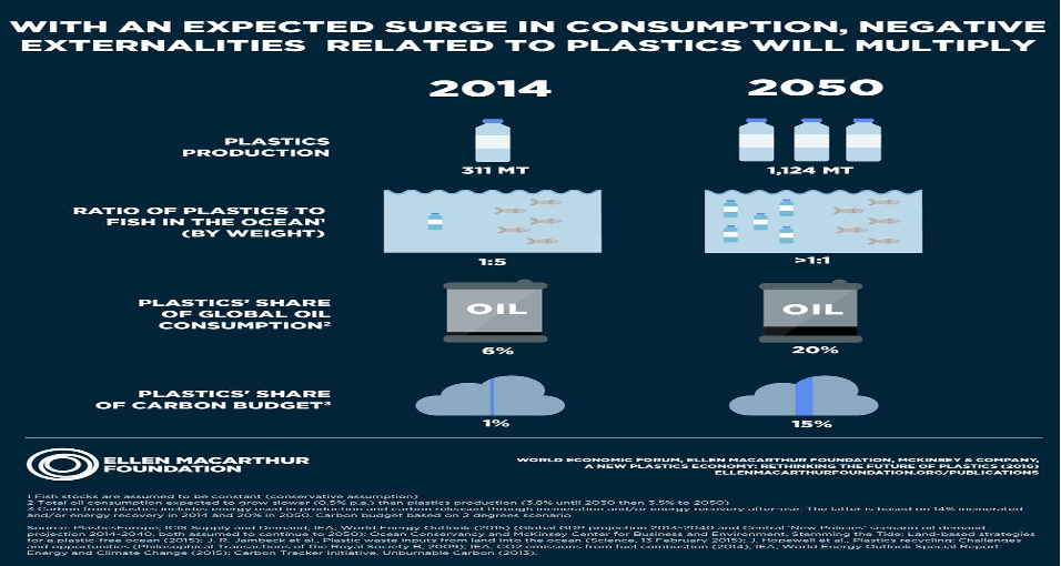 According to latest report launched by the Ellen Mac Arthur Foundation at the World Economic Forum, disclosed that at least 8 Million Metric Tonnes of plastics is leaking into the ocean, which is equivalent to dumping the contents of one garbage truck into the ocean every minute and if no action is taken, this is expected to increase to two truck per minute by 2030 and four per minute by 2050 and would reach the stage of more plastic than fish in ocean. Countless tiny fragments are drifting to bottom of the ocean, carpeting the sea bed and the environment and health impact is exactly unknown, but one thing the process releases toxic chemicals that may be digested by fish and end up in the human food chain.