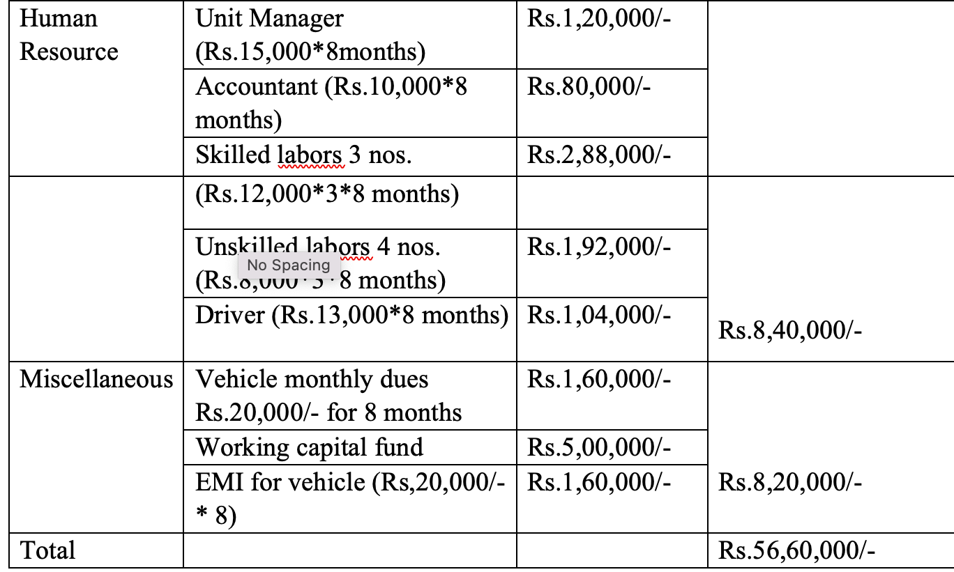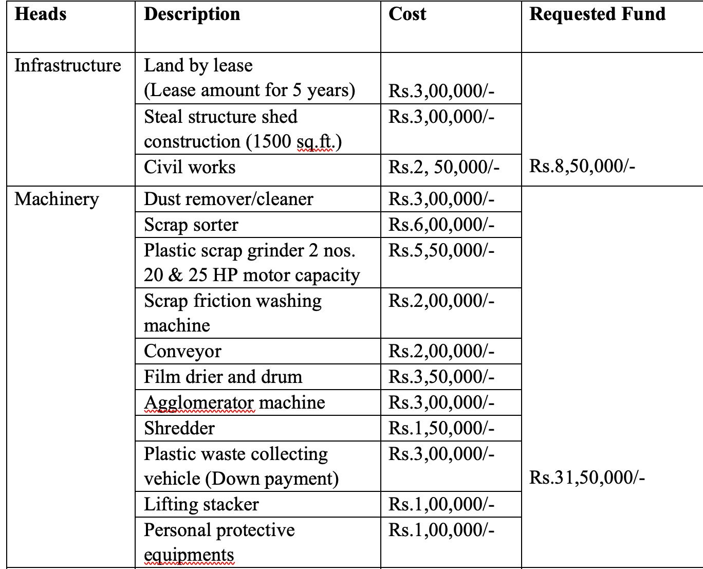 The project of establishing the single used plastic waste recycling unit requires the support of generous benefactors in order to move forward. The table below outlines the estimated costs associated with the projectfor which funding is required for a specific period of time until financial input generated during the course of the project for self sustenance.